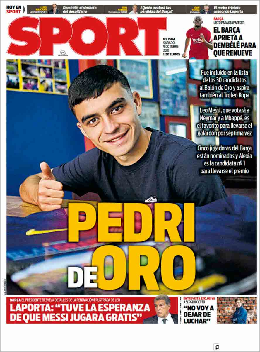 “Pedri de oro” nos parece candidato al top ten de titulares espantosos, sin gracia ni musicalidad alguna, firme aspirante al título junto al “FeliciRondo”. Por fin algo que no sea su corte de pelo nos llama la atención acerca de este joven canario y es su sorprendente inclusión en la lista de 30 aspirantes al Balón de Oro, una muestra más del poder de la prensa cuando les da por repetir un mantra hasta la sociedad.