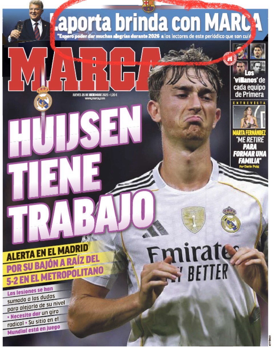 No por lo de Huijsen, sino por acoger en su frontispicio el brindis navideño ni más ni menos que de Jan Laporta, en un movimiento explícito hacia el culerismo, cargado de poder simbólico, que hasta la fecha no habíamos atestiguado.