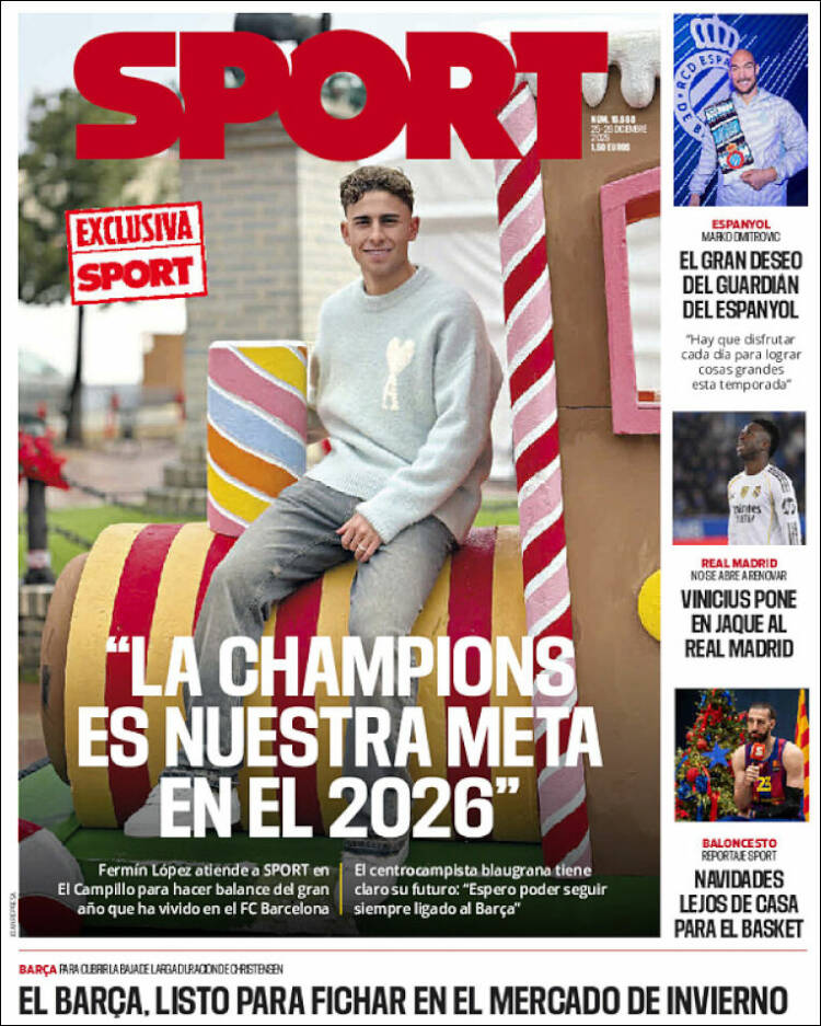 Sport, por su parte, estimula el lado más esteta del Portanálisis. El lema de la Galerna es “Madridismo y sintaxis”, implicando ello la búsqueda de la belleza en la medida de lo posible. Por este motivo, la portada de Sport nos electriza. No es el personaje, Fermín, gran jugador culé. No es lo que dice, pese a su originalidad, que la Champions es su meta para 2026. Es el jersey. La prenda en cuestión es de un color celeste, claro homenaje al Celta de Vigo, con el que el jugador mantiene una cariñosa relación, quizá merced a su gusto por las nécoras o los santiaguiños. El detalle es el As de corazones a la altura del corazón, pero en un intolerable color blanco. Un corazón blanco en un culé de la Masía es intolerable. El departamento de Compliance del Barcelona iniciará una investigación a ese respecto cuando acabe con lo de pagar dos décadas al vicepresidente de los árbitros y la utilización de mano de obra casi esclava en la obras del estadio. Hacemos votos para que no haya sanción para el jugador que, a fuer de sinceros, sentado en una especie de golosinas y con ese jersey, parece el miembro de Cantajuegos que se escindió de la formación y lanza su primer álbum en solitario.