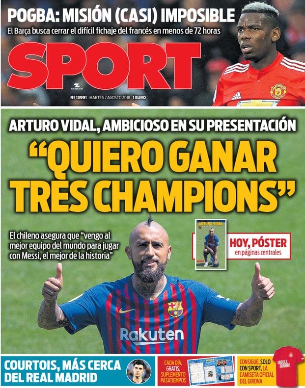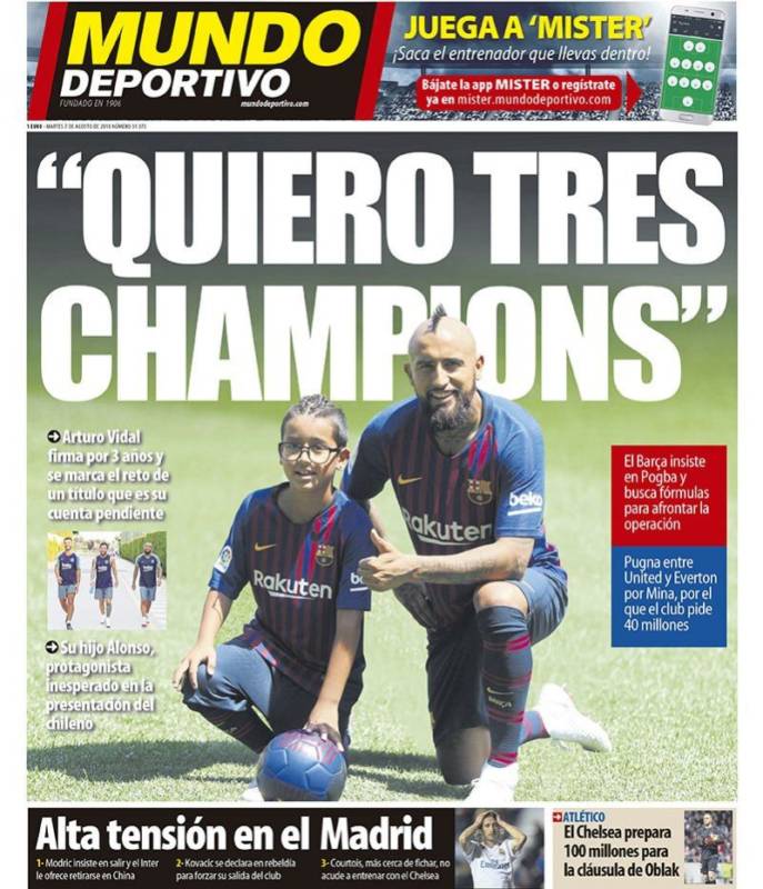 Buenos días. El Barcelona presentó este lunes a Arturo Vidal, uno de sus últimos fichajes. El canterano chileno -nacido en Barna- firmó por tres temporadas y dijo que estaba feliz por llegar "al mejor club del mundo" y que aquí puede cumplir su objetivo de "ganar tres Champions League". No se lo tendremos en cuenta, ya que creemos que el pobre tuvo un pequeño lapsus. Le dirían algo en catalán y la traducción que él hizo en su cabeza fue esa, pero ni está en el mejor club del mundo ni ese club es el más indicado para ganar tres Champions League seguidas.