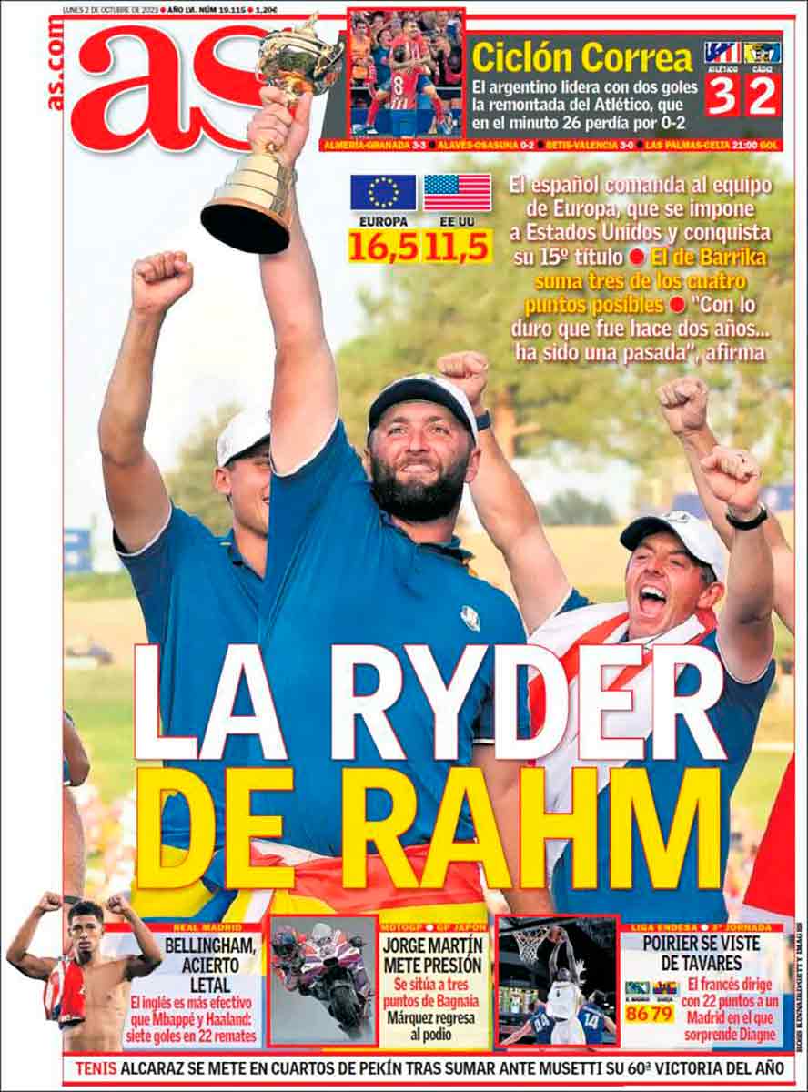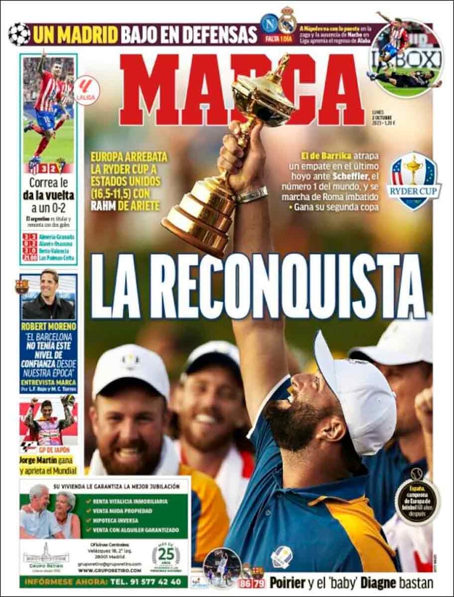 Marca entrega en su portada un espacio todavía más pírrico (medio faldoncillo indetectable) a la victoria de los de Chus en el partido más grande del baloncesto español. Como sucede con As, Jon Rahm marca la línea de esta primera plana, seguido por la victoria del Atleti con el doblete del cojo Correa. Decimos el “cojo” porque, como comentábamos en el portanálisis de ayer, ya sabéis que el Atleti culpó en su cuenta de Twitter a una entrada de Bellingham del presunto esguince de rodilla del delantero argentino. ¡Milagro! Podemos estar hablando del esguince de rodilla de más rápida recuperación de la historia del balompié mundial.