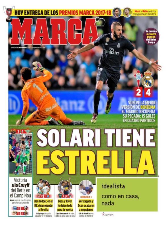 El único lunar está, como casi siempre, en la errónea lectura de la prensa. Las tendencias son evidentes, pero se empeñan en contarnos que lo ocurrido fue algo así como una casualidad, como un domingo un tanto extraño. Relaño dice que "Benzema tira del carro" y sus vecinos de 'Marca' apuestan porque "Solari tiene una estrella". Sí y no. Benzema tiró del carro con una exhibición y Solari tiene estrella, pero el de ayer no es el primer partido que Benzema juega de cine y Solari es mucho más que un técnico con estrella. El Real Madrid es otro desde que él tomó el mando. No es espectacular, tampoco vistoso en muchas ocasiones, pero sí fiable, intenso, constante. Y no sale dormido a los partidos. Para muestra, el primer cuarto de hora en Balaídos.