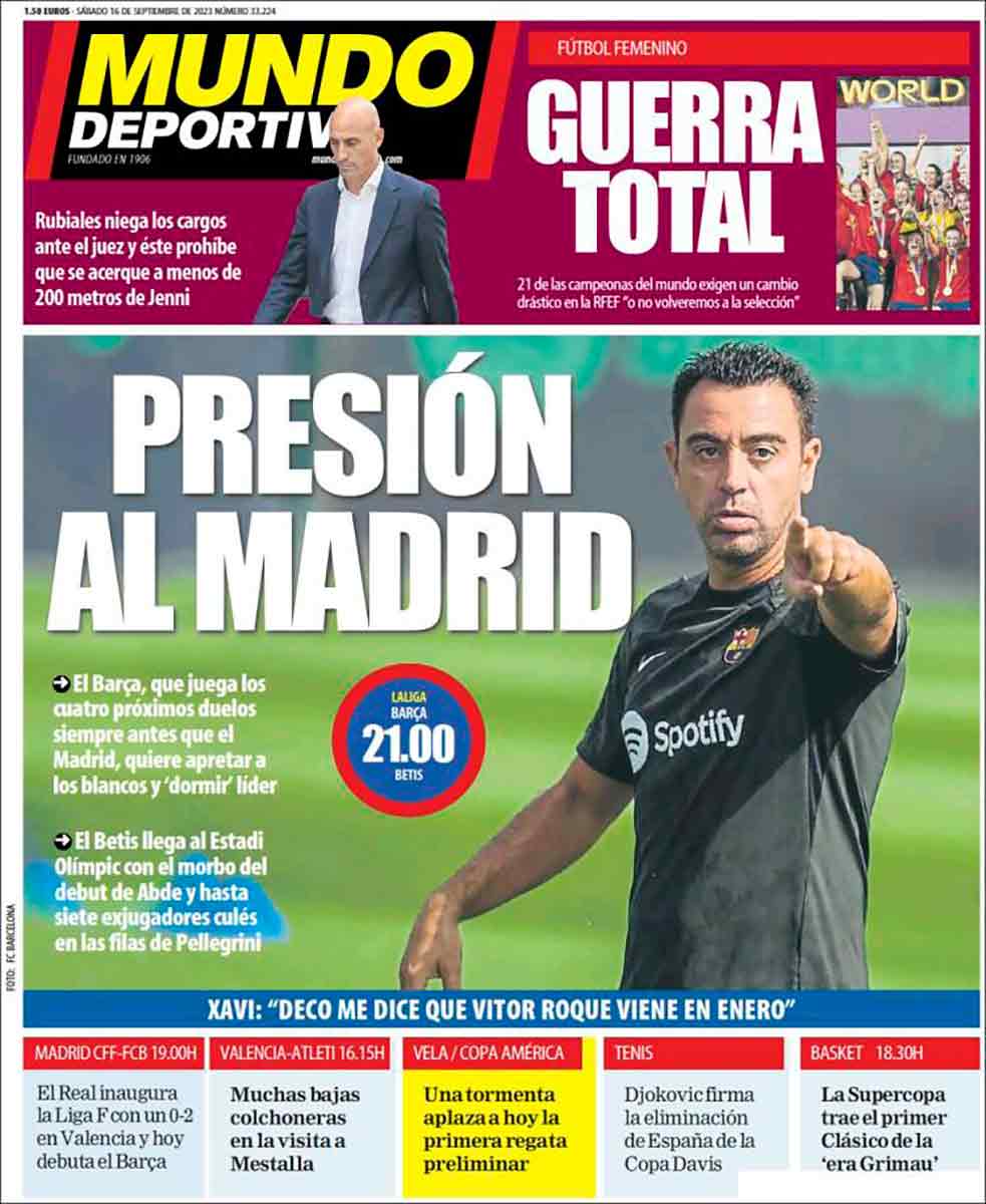 En esta tesitura, casi agradecemos al diario de Godó, grande de España, que vuelva a maridar su primera plana de confianza. Hernández y Madrid, así bien gordo, en el titular, siempre funcionan. Con tanto follón y tanto partido extemporáneo en Tiflis resulta que vuelve la Liga. El Betis visita la zona cero del PitorreoGate arbitral y dice Xavi que Vitor “Tócame” Roque viene en enero porque se lo dice Deco, que es un exjugador reconvertido a agente de futbolistas que pasa por director deportivo, y no una empresa de jardinería y decoración.