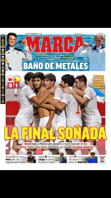 Excelente es la foto de Asensio tras anotar el tanto que mete a España en la Final, pero franco resulta el contraste este su brillantez y ese titular tan garbancero, amigos de As. ¿Cómo que “Gol de oro”? No solo es un topicazo, sino que además es falso. Lo que garantiza este gol es la plata, por lo que habría sido mucho más correcto asignarle ese metal precioso. Merced a ese gol de Marco, España se garantiza dicha medalla, quedando la opción del oro a expensas de ganar la Final a Brasil. Gol de plata, por tanto, que ya es bastante, y reivindicación personal del delantero madridista.