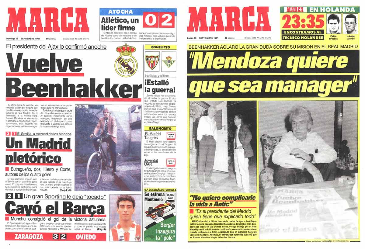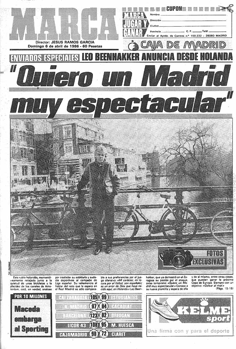 Marca fue directamente a buscarle a los Países Bajos con sus enviados especiales Ángel Retamar y Julio Palomar. Beenhakker se puso varios retos: “Quiero un Madrid muy espectacular. La Copa de Europa, por prestigio, debe ser una meta trascendental para nosotros”. Además, era consciente de que “es la gran oportunidad de mi vida; he luchado como loco para llegar hasta aquí”. En la entrevista dejaba claro su punto de vista futbolístico y era un estilo ofensivo y atacante: “El fútbol es para el público y hay que conseguir que se divierta. Lo bonito es dejar KO al rival, intentar golearle”. Por último, aclaró el aspecto del preparador físico porque él solía trabajar solo: “Tengo mis ideas sobre la preparación física. Aquí, en Holanda, al mismo tiempo que se prepara uno para ser entrenador, se hace un curso muy extenso y profundo sobre la preparación física. Quiere eso decir que se consigue compaginar la parte técnica y física, pero, cuidado, no quiero decir con esto que vaya a prescindir de un preparador físico. Si el Real Madrid tiene uno, y como creo, es muy bueno, podemos trabajar juntos”.