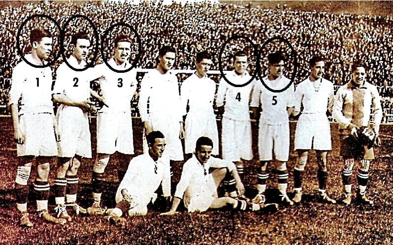 En la vuelta, sin embargo, perdieron y se tuvo que jugar un ‘replay’ en el campo Mercantil de Sevilla un día más tarde. El ataque madridista volvió a cuajar un excelente papel y, con cuatro goles en su haber, pasó a semis. Allí esperaba un duro FC España de Barcelona, con el que se jugaron cuatro choques. El quinteto al completo participó en el tercero, el primer desempate que concluyó con tablas en el campo de La Industria. Tras vencer 20 días más tarde en el segundo ‘replay’, el Madrid accedió a la final de Copa, aunque con una baja de suma importancia: Santiago Bernabéu, que resultó lesionado. Sin el futuro presidente, pero con sus cuatro socios del frente ofensivo más Muguiro, se venció al Arenas por 2-1 para conquistar aquella edición del trofeo del KO.