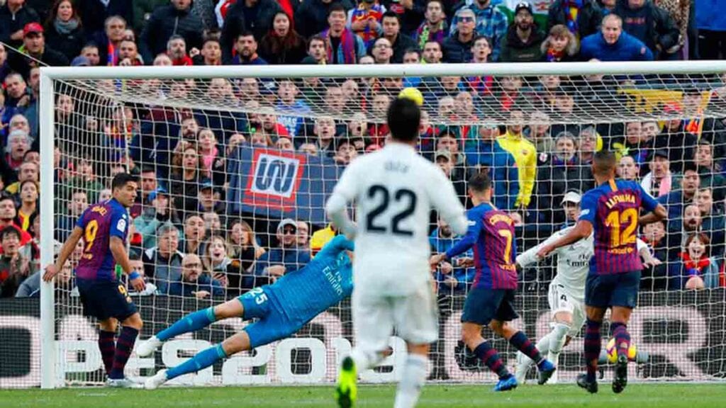 lugar sustituye a Messi por otro centro campista, jugando SIN COMPLEJOS un 4-5-1, con lo cual consigue dos cosas a) algo obvio superioridad en el centro del campo y2) desbaratar los ataques del Madrid pues Valverde con gran perspicacia por su parte, piensa y con razón que el Madrid ( que no esta para nada) se va ir hacia arriba,( por unas supuestas urgencias y porque somos el Madrid) facilitándole el trabajo defensivo y salir a la contra sin arriesgar nada, entiende el entrenador catalán que en el sistema del Madrid hoy un 4-4-2 más tarde o más temprano le cogerán la espalda a uno de los laterales, a Marcelo porque baja al trote cochinero si baja y a Nacho, `porque no es lateral y no es su especialidad medir las subidas, aparte de que su calidad va justa para esta clase de partidos. Efectivamente en el minuto 11 de la primera parte a Nacho le ganan la espalda, alguien no le hace la cobertura y 1-0, poco después el penalti estúpido de Varane.