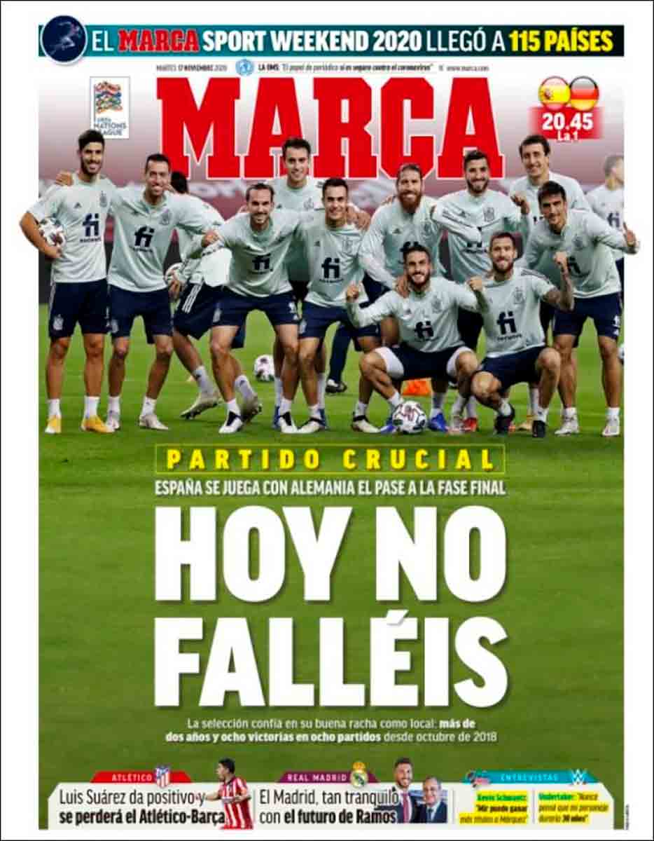Los diarios intentan cautivar nuestra atención con portadas como la de Marca, que cataloga de “partido crucial” el encuentro de esta noche entre España y Alemania. Pues mirad, Marca, el aficionado madridista (y con seguridad el resto) está más interesado en comentar en las redes sociales la última serie que está en boga, o en compartir recetas de boniato al horno, o incluso en contar las gotitas de gotelé que tiene su pared, esa que está deseando pintar con acabado liso, pero que por unas cosas o por otras, aún no ha podido. “Hoy no falléis”, añade el diario de Gallardo, mientras al seguidor madridista probablemente le falle la memoria y, en lugar del encuentro, termine viendo un concurso vespertino de la televisión.
