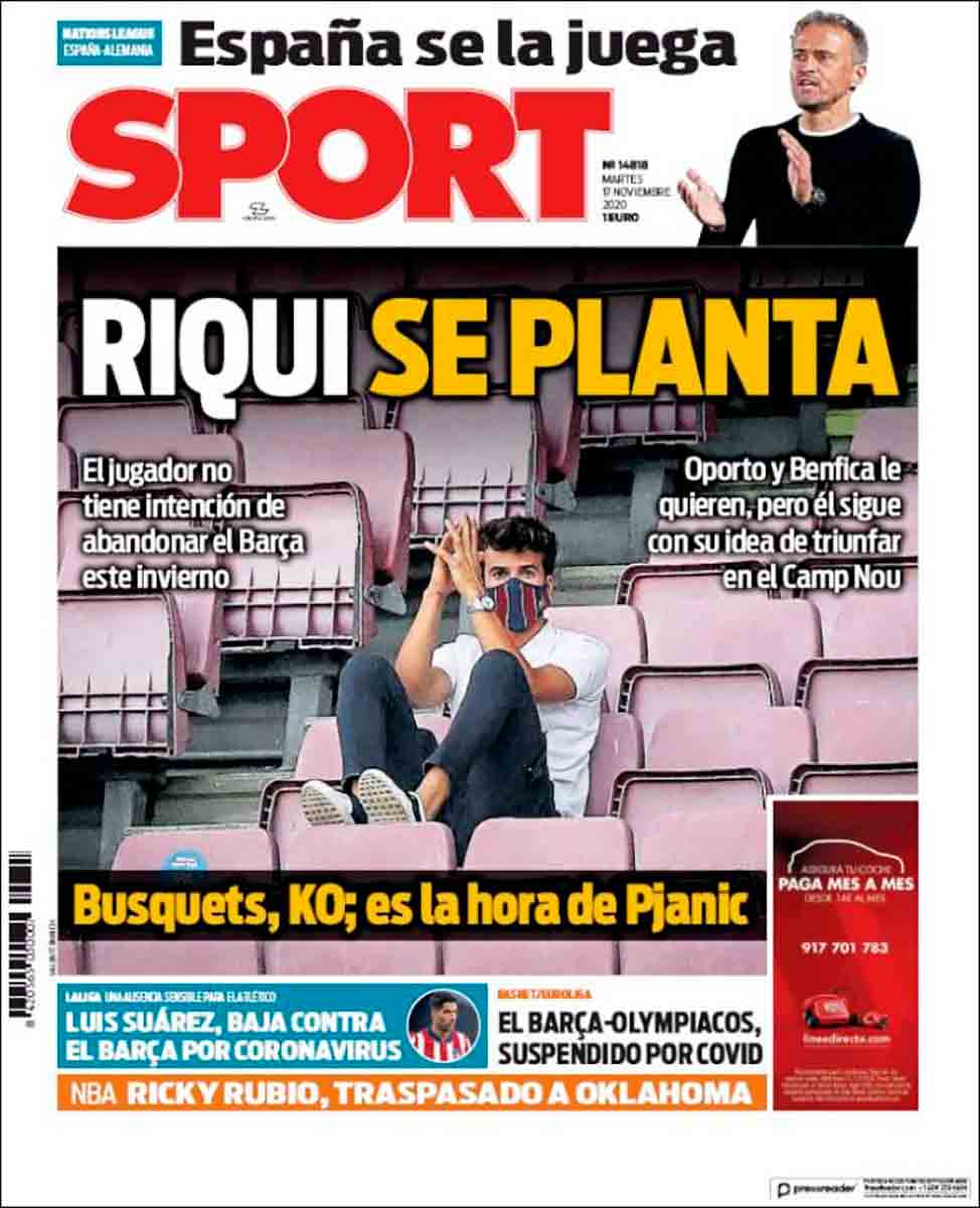 Tal es la apatía, la languidez, la desgana que provocan los parones de selecciones, que Sport ha perdido la cordura (si es que alguna vez la tuvo) y se aferra a la cuerda de Amanece que no es poco: “Riqui se planta” titulan. Lástima que hayan elegido una foto del futbolista en las gradas y no en el bancal, con medio cuerpo aún sin brotar y Pastora Vega cuidándolo. Sé que esta teoría puede parecer descabellada, pero hay otro dato que la apoya: en el faldón, Sport afirma que Ricky Rubio ha sido traspasado a Oklahoma. Todo encaja, recordemos que Antonio Resines es ingeniero y da clases en Oklahoma, pero ha venido de año sabático a España, de modo que Ricky Rubio será su sustituto en Estados Unidos.
