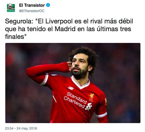 Sin embargo, el antimadridista mayor del reino no es ningún periódico. El rey de reyes es Santiago Segurola. Club que se mide al Real Madrid en Europa, club que sale mal parado. Los del Manchester City estaban gordo, los de la Juventus eran viejos, los del PSG unos ricos sin ambición, los del Bayern unos cracks en declive y los del Liverpool, rival blanco en Kiev, son, directamente, los más débiles que se ha encontrado el actual campeón de Europa en sus últimas finales. ¡Toma ya!