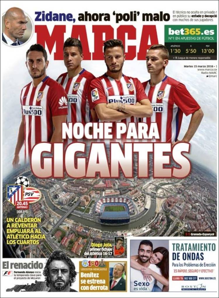 "Zidane, ahora 'poli' malo" dicen los infrasers, "Noche para gigantes" afirman sobre los indios que juegan contra el coco de la Copa de Europa, el PSV. ¡Madre de Dios!