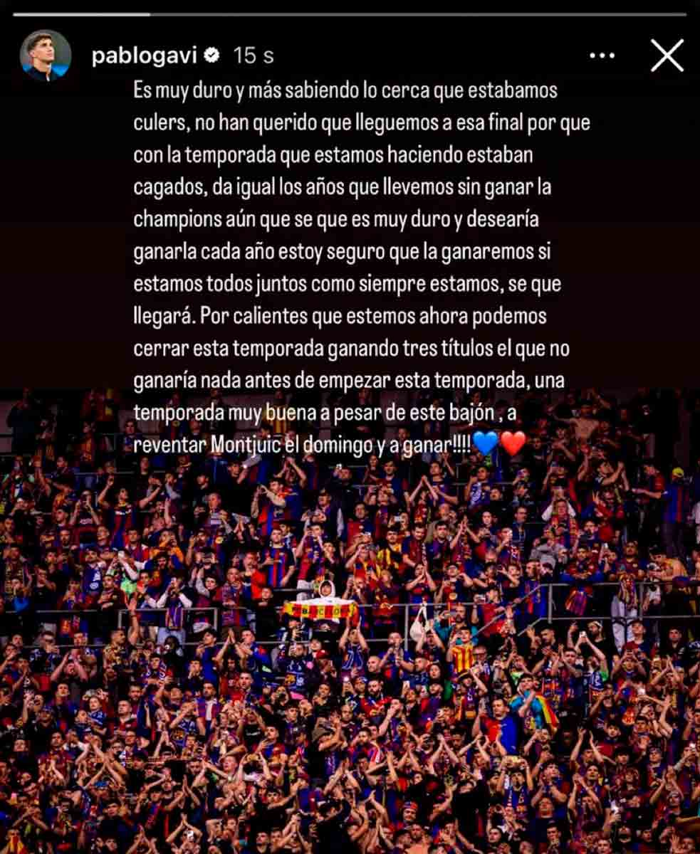 Otro que ha hablado es Gavi. En realidad no ha hablado. La cosa no habría sido tan grave si hubiera expresado sus quejas por vía oral. El problema es más grave: Gavi HA ESCRITO (es un decir). Nos hemos asomado a su mensaje de Instagram y, como ayer dijo Jesús Bengoechea, hemos sufrido una triada con rotura de ortografía anterior, sintaxis colateral interna y semántica cruzada lateral. Pendiente de evolución.
