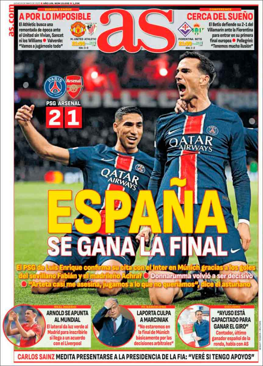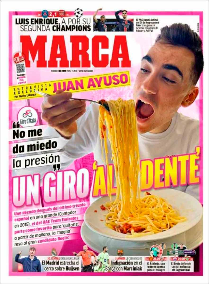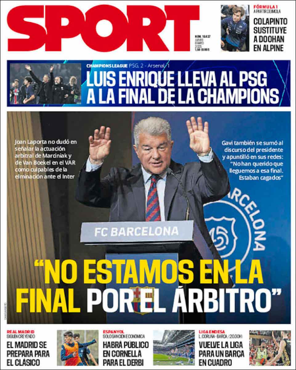 Sport se autodenomina portavoz de las ridículas quejas arbitrales culés, y como tal trae en portada el ejercicio de plañidera extemporánea de Laporta, quien asegura que si el club cliente de Negreira no está en la final de la Champions es por el arbitraje del polaco Marciniak. Laporta aparece en ademán extraño en la foto de esta inenarrable primera plana, como si fuera Mazinger Z y estuviera asiendo los pechos de Afrodita A que, convertidos en sendos misiles, le permitieran volar. Por eso Laporta está como mirando abajo, presa del vértigo, o tal vez solo está buscando algún apéndice que echa en falta por mor de los accidentes geográficos.