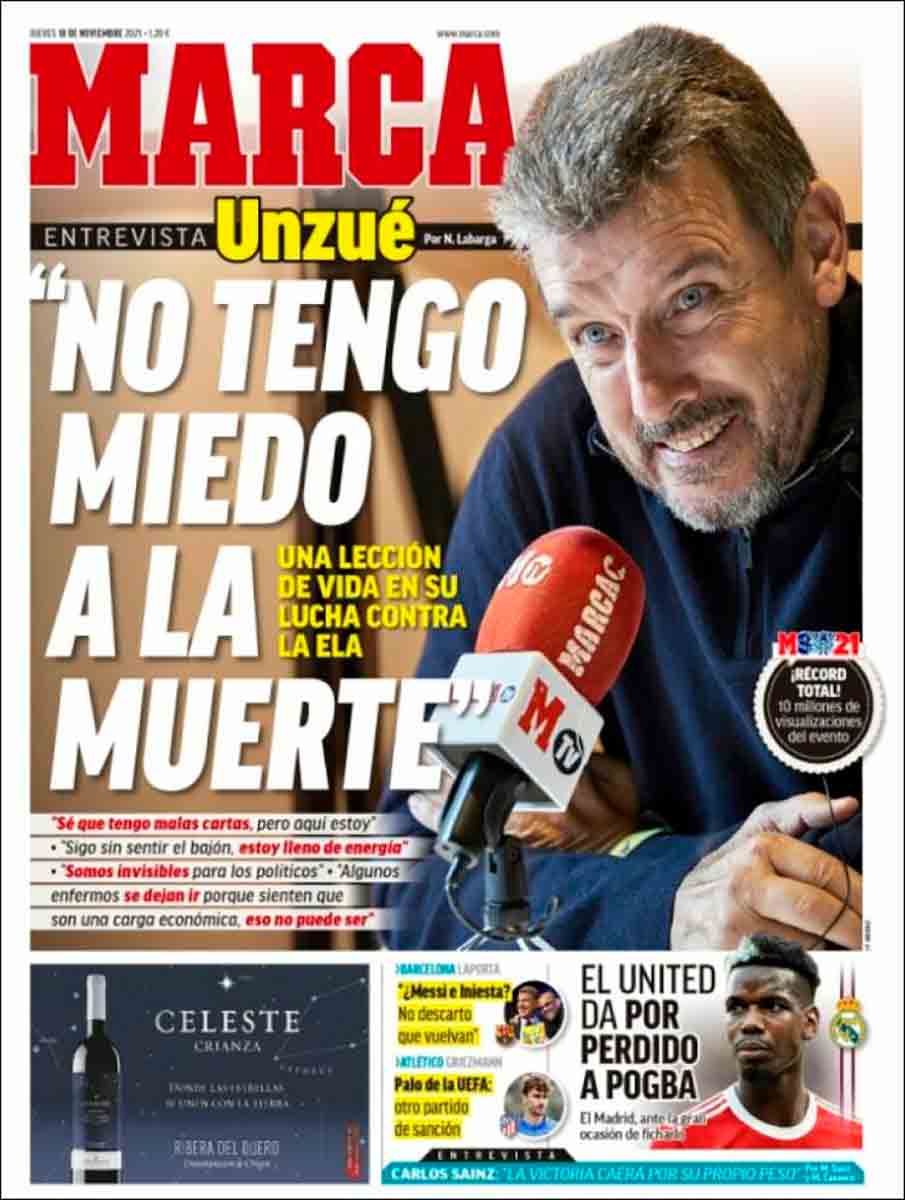 Marca utiliza su primera plana para dar visibilidad a la ELA (esclerosis lateral amiotrófica) —enfermedad grave del sistema nervioso para la cual aún no existe cura— mediante una entrevista a Unzué que sirve para dar voz al colectivo de enfermos de esta dolencia.