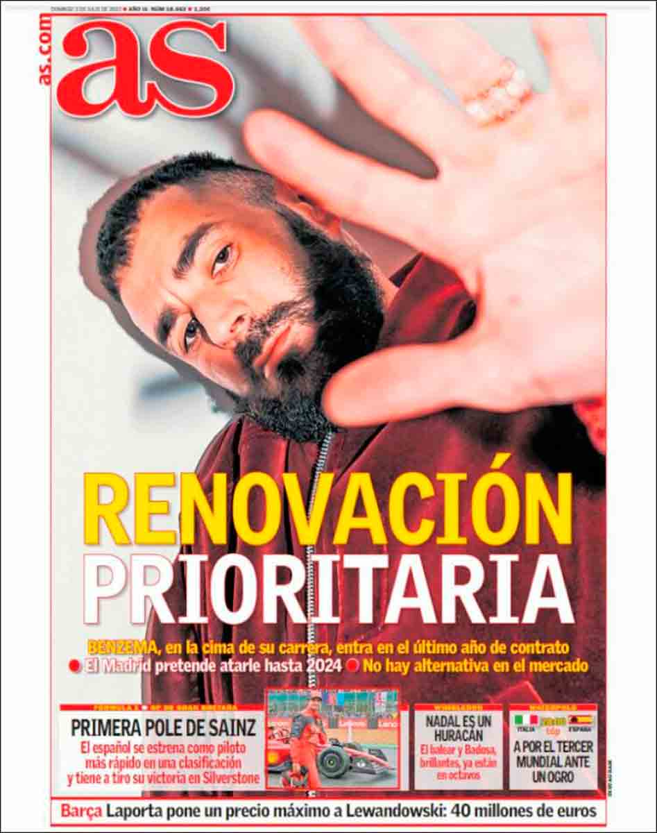 - Pues sí, es una portada muy poco glamurosa. Sobre todo porque se trata de Karim Benzema, el mejor jugador de este año, el futuro Balón de Oro, sin duda. Tratan de contarnos que su renovación es prioritaria cuando todos sabemos que se retirará en el Madrid cuando quiera, no hay urgencia alguna. Además, ahora es nuestro Gran Capitán, un líder, como puede leer en este artículo de ayer mismo.
