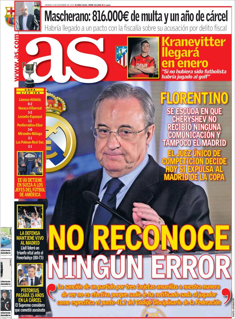 En cuanto al asunto de la alineación indebida creo que el portanálisis de ayer, jueves 3 de diciembre, detalla bastante bien la situación y no añadiré más, pues es muy probable que no hiciera más que estropear una información que otras personas más válidas que yo han redactado de una manera fantástica. En lo que quisiera hacer hincapié, más allá de la tremenda torpeza que parece que muestra el Real Madrid en este caso, es en que se tiene todo el derecho del mundo y creo que también la obligación de tomar todas las medidas posibles para defender al club y sus intereses. La prensa debía esperar que Florentino Pérez saliese ayer a autoflagelarse y a anunciar el advenimiento de las plagas bíblicas en el seno del Real Madrid como consecuencia de este incidente, o bien la ansiada dimisión del presidente, o algo similar que mi mente no alcanza a imaginar. En definitiva, nada nuevo bajo el sol, tanto este asunto como los demás que fenomenalmente se indican en el portanálisis de hoy.