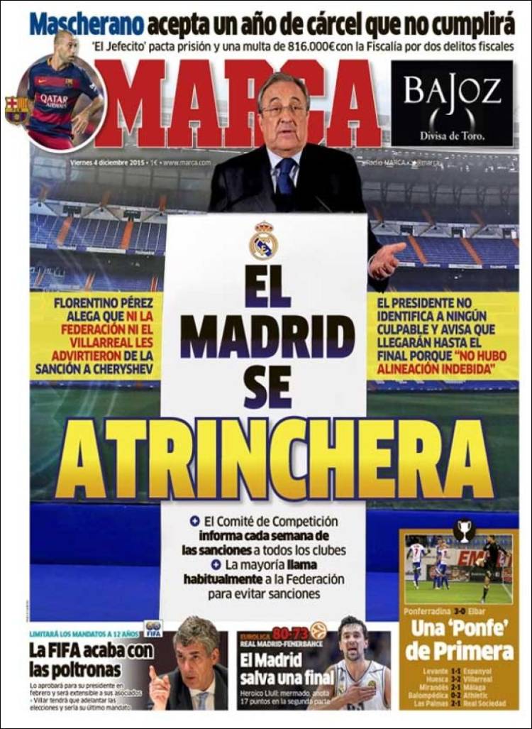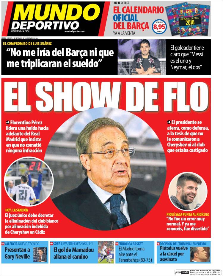 Al menos nos resulta más gracioso el titular escogido por Mundo Deportivo para su portada. “El Show de Flo”, apunta jocoso el diario de Godó, grande de España. Dadas las circunstancias, desconocemos cómo titularía MD el breve sobre Mascherano que la Central Lechera sí recoge en sus portadas y que desaparece cual truco de prestidigitación en la prensa catalana. El Jefecito acepta un año de cárcel y una multa de 816.000 euros por sus pufos con la Agencia Tributaria, pero oiga: el show es nuestro. No les quepa duda. Lo que viene justo debajo de estas líneas, en la parte superior de la portada de Marca, apenas tiene importancia.