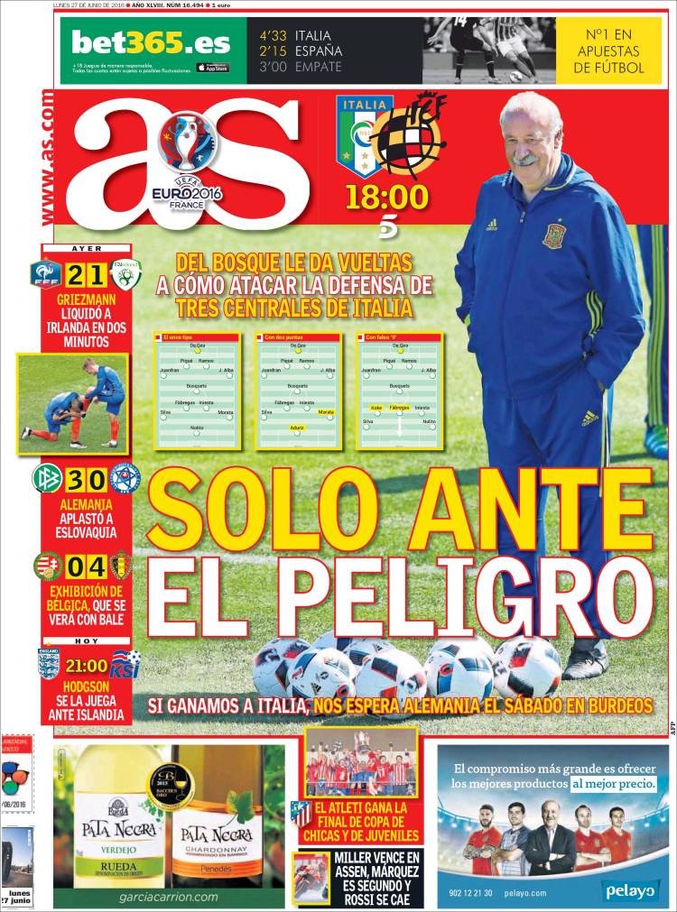 Así, y por estar paradas las rotativas en la madrugada, ninguna de las portadas del día se hace eco de lo que sucedió anoche en la final de la Copa América, y dado que para la hora que salgan mañana habrá otros asuntos más recientes de los que ocuparse (entre ellos la suerte de España ante Italia en la Eurocopa), es de prever que dicha final tampoco tenga excesivo eco en las portadas del día de mañana. Os dejamos ver las de hoy, para que comprobéis que el fiasco de Messi no aparece por ningún lado, y continuamos.