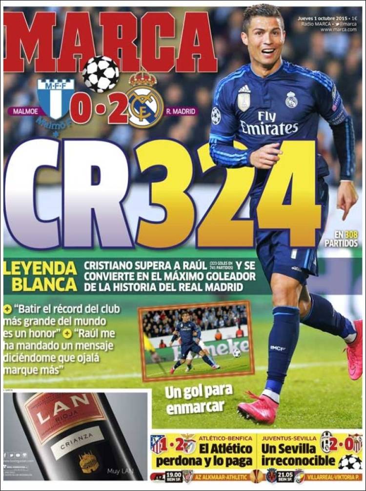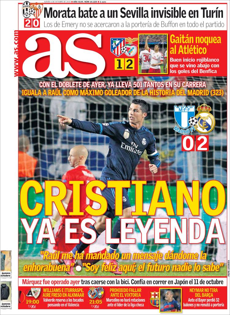 Lo que pasa es que AS, que ni organiza Pichichis ni es el diario (ni deportivo ni general ni nada) más leído de España descuenta dicho gol a CR7 para anotárselo a Pepe. Así, según AS son 323 (y no 324) los goles de CR, con lo que no supera a Raúl sino que lo iguala y el luso no es el máximo goleador histórico del Real Madrid en todas las competiciones sino sólo en la Champions. “Cristiano ya es leyenda” resume As. Lo vuestro sí que es legendario: los dos diarios deportivos de Madrid racaneando por un gol del que hace pocos días llamaba el propio Marca “Pichichi sin gol”.