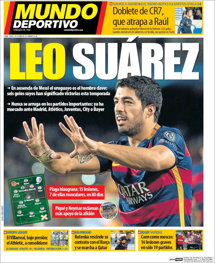 Mundo Deportivo, como siempre al filo de “su” actualidad nos regala un “Leo Suárez” de antes de ayer que a la par que rememora el gol de la victoria del uruguayo ante el todopoderoso Leverkusen nos evoca a un aterrador enano con dientes largos. Por cierto, un titular vilmente copieteado al de la edición digital de Marca. Eso sí lo copian al Diario de la Hernia: no así las estadísticas de los goles de Cristiano. En esto, Sportivo, Mundo Deportivo y Relaño se parecen más de la cuenta.