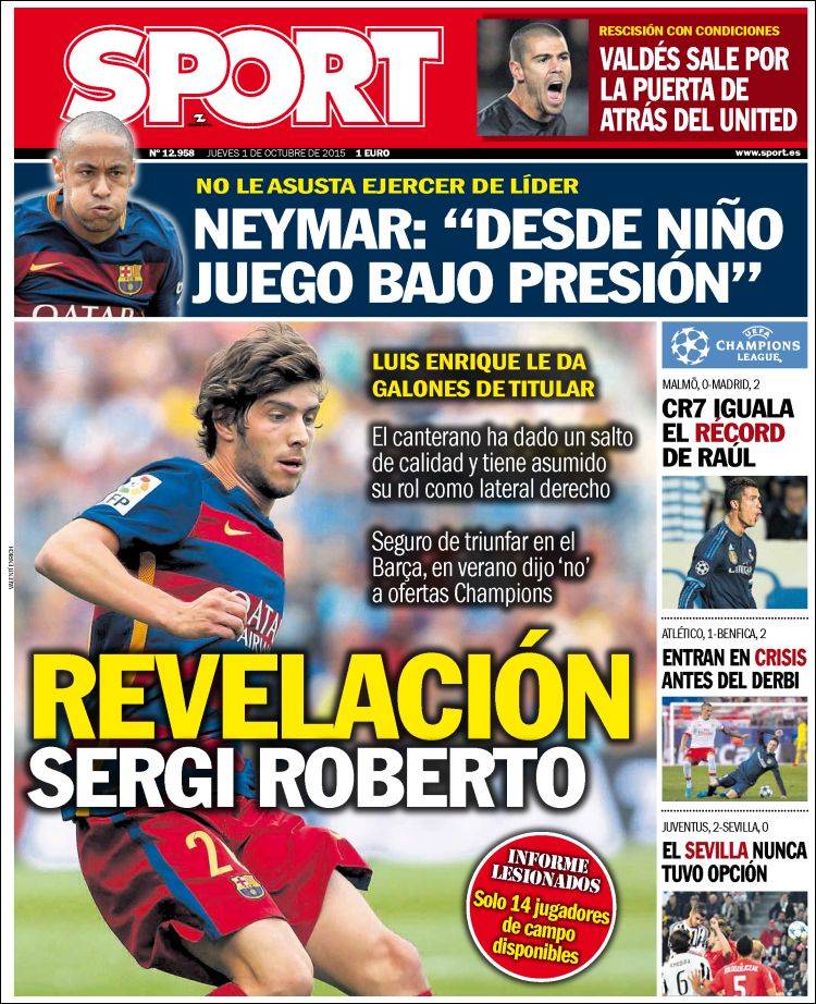 Como Sportivo, Mundo Deportivo sigue anclado en la Matrix culé que viene a ser como la Aldea del Arce pero con Boixos Nois. El bueno de Sergi Roberto ha tenido que marcar un gol con el juanete para que le reconozcan como “Revelación” cuando lleva supliendo (y mejorando) a Dani Alves desde la jornada 2. Qué bueno que te recuperaste, Dani. Autopista hacia el cielo en el Bernabéu el próximo 21-N.