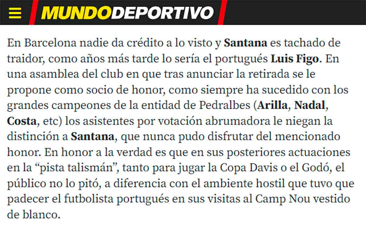Solo alguien feo por dentro aprovecha el fallecimiento de una Leyenda como Santana para vomitar su fanatismo culé en un artículo en el que acusa a Manolo (que era más madridista que Bernabéu) de traición por cambiar de repente el RCT Barcelona por la sección de tenis del Real Madrid justo antes de Wimbledon. Pero es que además, la bazofia que derrama el interfecto es falsa: Manolo ya había estado antes en la sección del Madrid, que además no se había creado deprisa y corriendo para el torneo inglés. Si Santana demostró su grandeza toda su vida, Canut hace lo mismo, pero con su mediocridad.