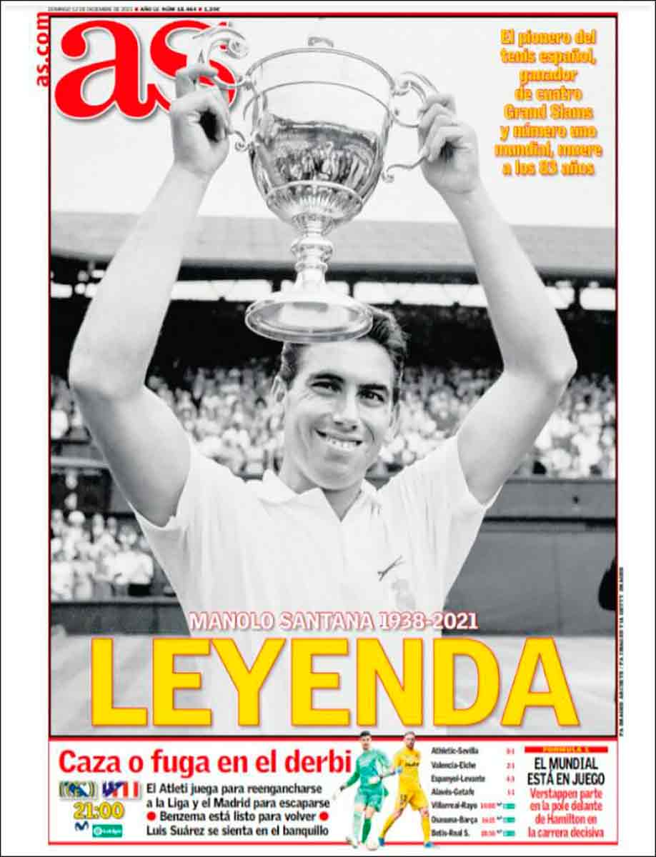 Marca y As eligen para su primera plana la imagen de Santana levantando el trofeo de Wimbledon ataviado con su polo blanco con el escudo del Real Madrid cerca del corazón.