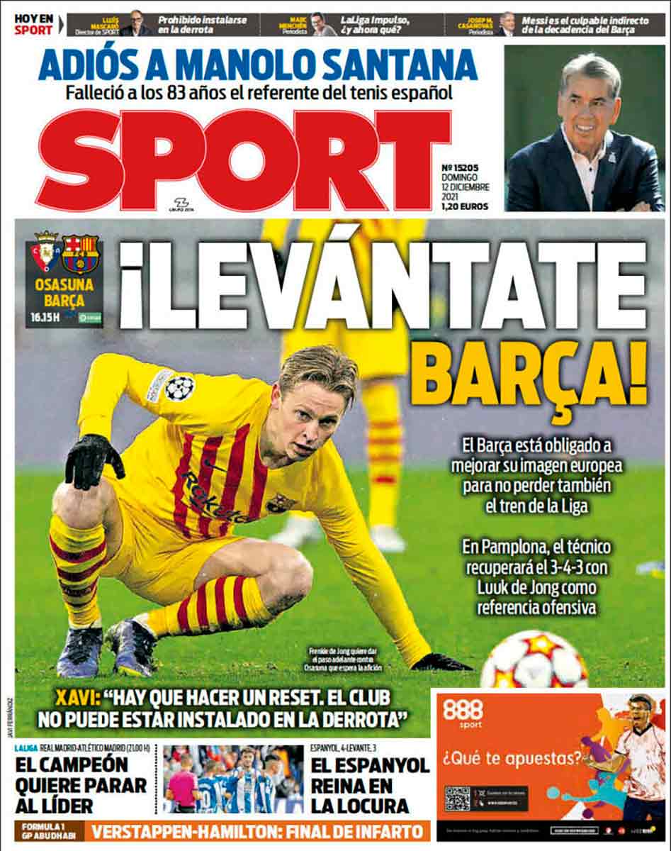 Sport, a diferencia de Mundo Deportivo, opta por escribir mal su titular y zamparse la coma del vocativo: “¡Levántate Barça!” en lugar de ¡Levántate, Barça!