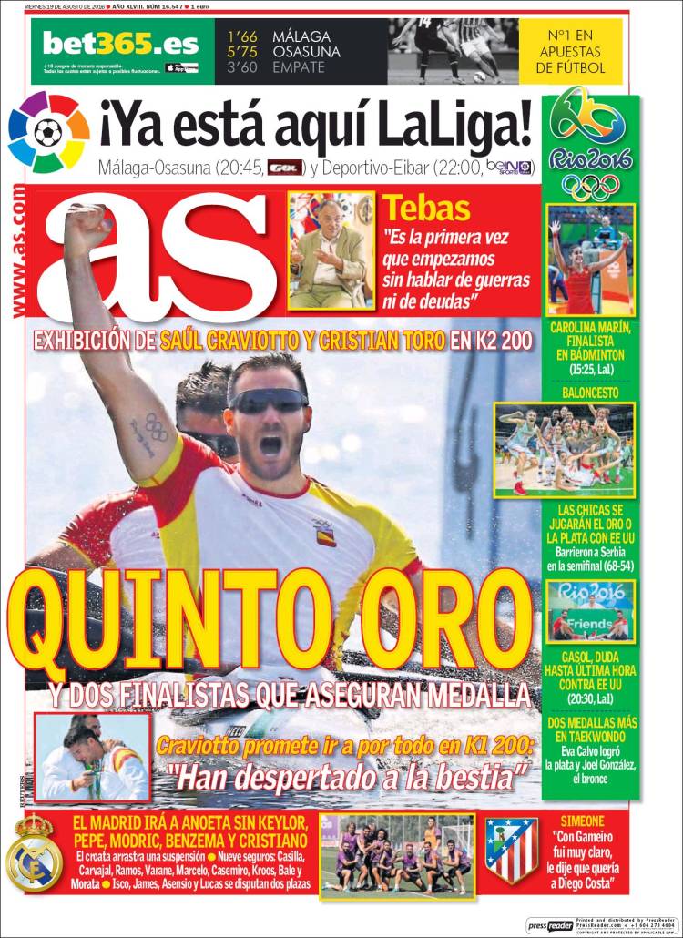 as.750Aunque le dé su portada al nuevo oro olímpico en piragüismo, As encabeza su portada con un anuncio del arranque de la competición de la regularidad ("¡Ya está aquí la Liga!"). Se da la paradoja (y de esto hablaban en el fondo Hugues y Losantos en aquella agradable charla) de que el Madrid aspira a la máxima regularidad desde la máxima exigencia que demanda su Historia, aunque en el fondo la deplore desde su alma hechizada por la gesta. Sí, sabemos que la regularidad puede ser una gesta en sí misma, pero el espíritu quintaesencialmente vikingo es una cosa que tiene más que ver con perder estrepitosamente con el Wolfsburgo y remontar luego para que no se diga que la marca de la casa se ha diluido con el tiempo. Al Madrid la Liga se le queda pequeña y eso que en La Galerna la escribimos así, en mayúscula, acaso para convernernos o convencerles (o convencerla) de que la Liga nos colma no tanto pero sí casi tanto como la Champions, y que la regularidad es una cosa tan plausible como el beso en la frente a la madre de tus hijos, aunque lo que de verdad estremezca es la perspectiva de la conquista fugaz, enconada, imprevista y europea. "Sabes mejor que yo que hasta los huesos / solo calan los besos que no has dado / los labios del pecado". Es mentira que Sabina sea del Atleti, diga lo que diga.
