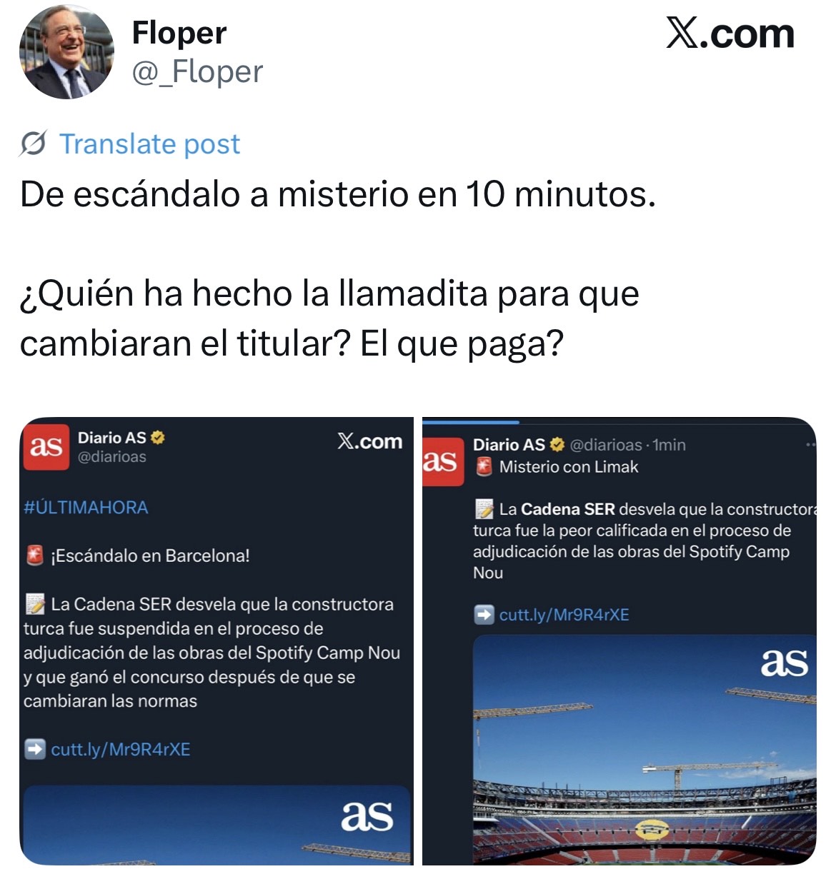 “Escándalo”, posteaba con toda la razón el responsable de redes de As, a cuenta del  BarçaLimakGate. De manera intrigante, al cabo de pocos minutos, el post desparecía para ser sustituido por este otro.