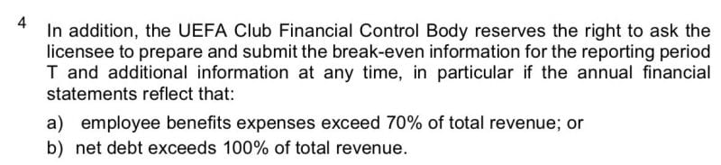 Ateniéndonos a la traducción literal, no es una norma que no se pueda exceder. Dicta que, si un club supera ese 70%, la UEFA se reserva el derecho de solicitar Break-Even Information, es decir, información adicional para clubes monitorizados (vigilados) por UEFA por posibles incumplimientos del FPF. Es necesario decir que en este artículo 62 se detallan todos los indicadores que UEFA considera como incumplimientos del FPF.