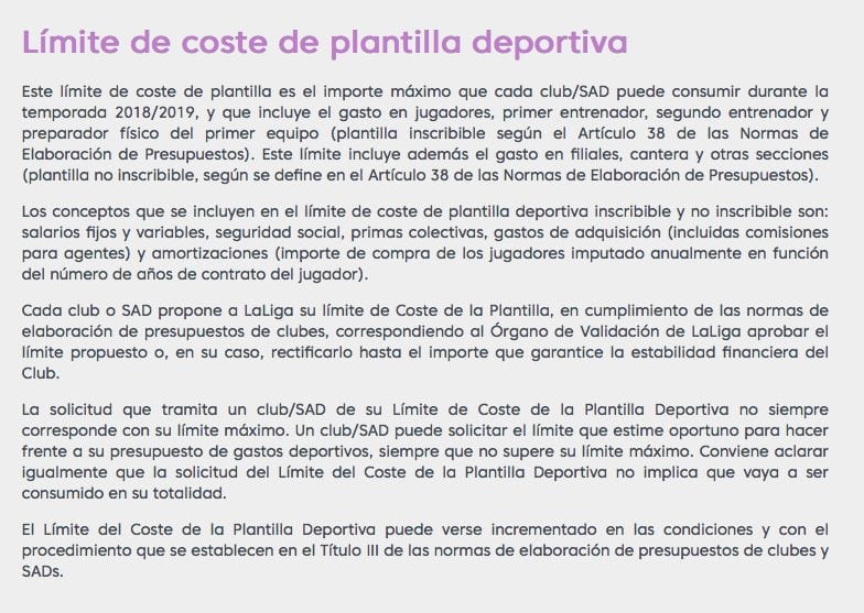 El límite salarial engloba cualquier gasto en jugadores, primer y segundo entrenador, preparador físico (plantilla inscribible) y gasto en filiales, cantera y otras secciones (plantilla no inscribible).