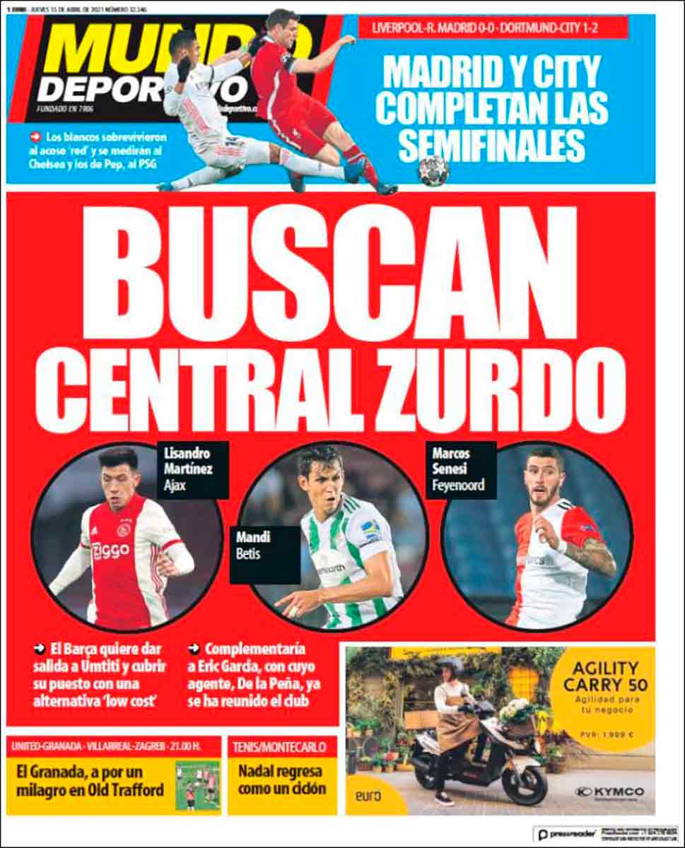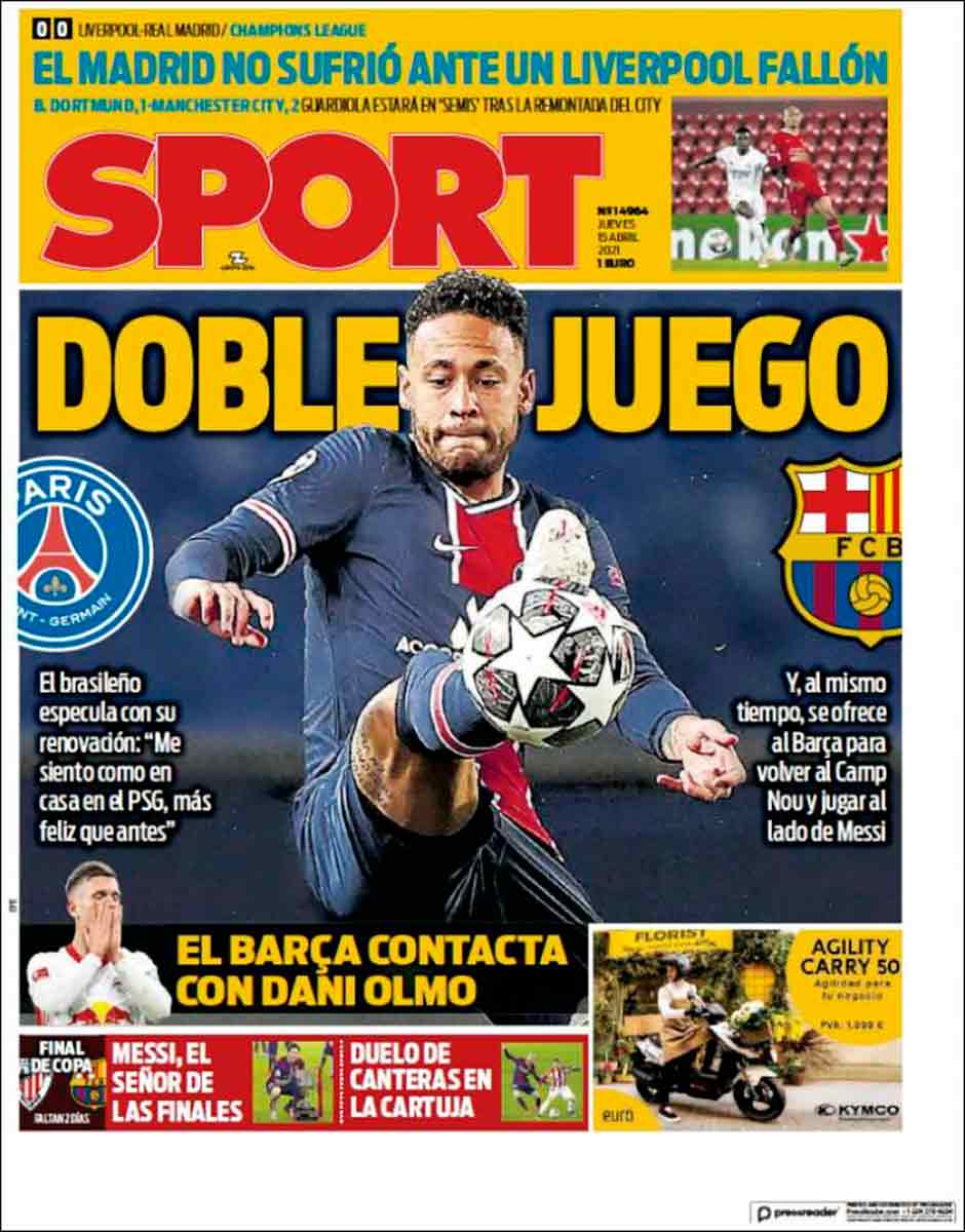 Y la portada de Sport más previsible que un capítulo de El equipo A, por lo que no puede faltar su menosprecio a nuestro pase a semifinales de Champions: «El Madrid no sufrió ante un Liverpool fallón». El que no sufrió fue el Barça, que no jugaba la Champions por haber caído eliminado una vez más por goleada. Bueno, seguro que sufrió, porque para el ADN Barça es igual o más importante la derrota blanca que la victoria propia. Además, podemos asegurar que el Madrid sufrió las violentas entradas del Liverpool, que dejaron maltrechas las extremidades inferiores de Benzema, Casemiro o Valverde, entre otros.