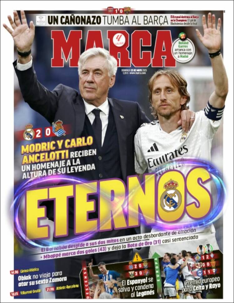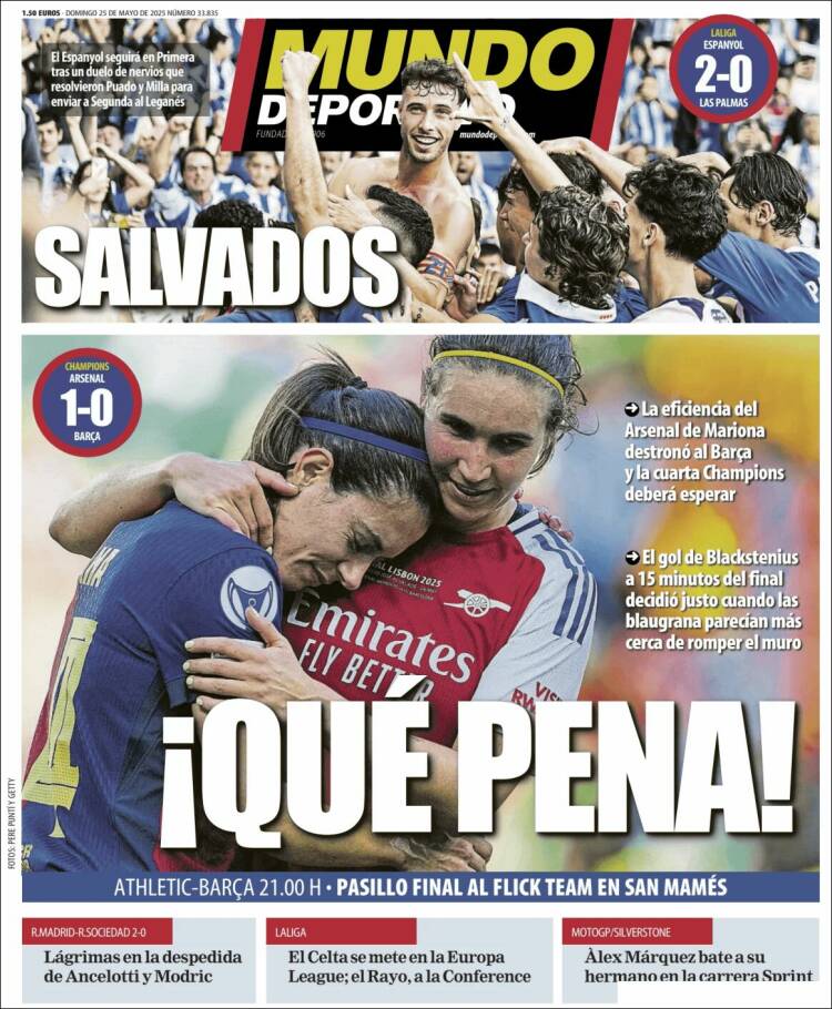 Todo lo bello y edificante que sucedió ayer en el Bernabéu es reducido por la prensa cataculé a un mero apunte en un faldoncillo. Allá ellos. Ayer tuvieron, en cambio, una mala tarde. Su Barça femenino perdió la final de la Champions ante el Arsenal. No vamos a decir que la noticia nos rompa el alma en mil pedazos. Mundo Deportivo dedica gran parte de su portada, también, a ensalzar el éxito del Espanyol, que permanecerá un años más en Primera. Es una noticia que nos alegra por amigos como nuestro querido colaborador Tomás Guasch o los Marañón, Rafa y Carlos.