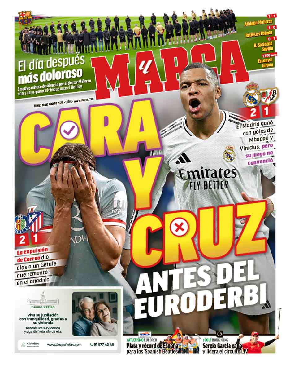 Marca titula «Cara y cruz» en referencia a los resultados de Madrid y Atleti antes del choque de Champions. Pero, como decíamos al principio, también puede aplicarse a cada uno de los encuentros. Si los blancos ganaron pero no convencieron, los colchoneros perdieron, pero la actuación del CTA, una vez más personificado en el hincha rojiblanco Cuadra Fernández (secundado en el VAR por el inefable Figueroa Vázquez), volvió a ser una oda a la competición adulterada que sufrimos. Lo feo. Muy feo. Aunque también malo.