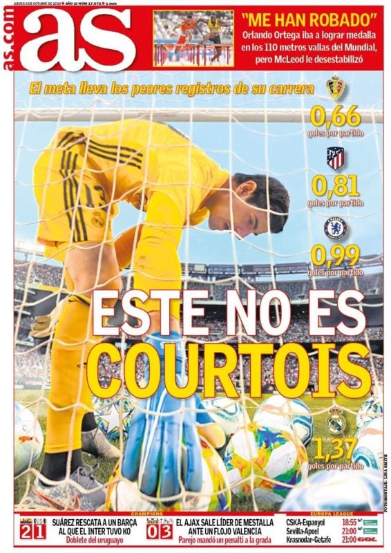 Buenos días. De igual manera que la portada sobre Hazard que hace dos días nos regalaba As resultaba un atentado contra la mínima ponderación y prudencia cuando se trata de juzgar a un jugador, esta primera plana de hoy sobre Courtois es, para nuestra desgracia, inobjetable.
