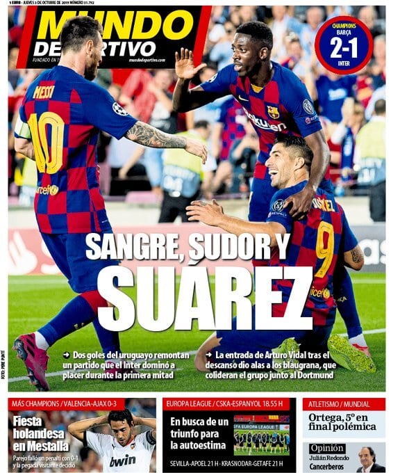 Decimos que el triunfo de ayer ante el Inter fue legítimo porque jugar mal, siendo superado por tu rival, pero ganar merced a la eficacia de tu delantero centro es una vía válida hacia la victoria. Ojalá el Madrid tuviera esa pegada. Lo que no entendemos es eso de “con un par” que nos suelta Sport para ilustrar la foto de Suárez. Con un par de qué. De puños, imaginamos. O de colmillos.