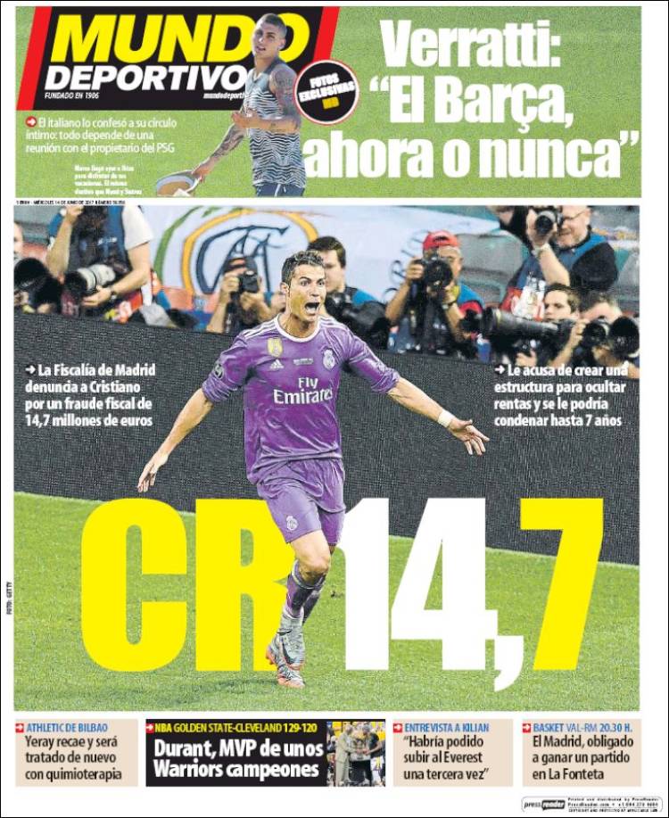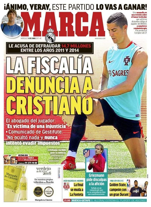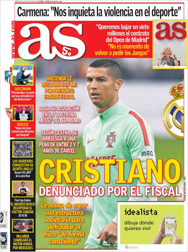 La prensa madrileña, por su parte, difiere en lo que enfatiza. La portada de Marca cuenta lo que sucede pero hace hincapié en los argumentos de defensa de Cristiano, mientras la de As cuenta lo que sucede recreándose en los augurios más estremecedores. Lo esperado, también.