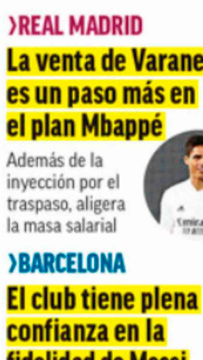 La sensación, como explica la captura que hemos hecho de la portada de Marca, es en efecto que se sacrifica fortaleza defensiva a sabiendas de que se hace, en aras de llenar las arcas para afrontar el fichaje de Mbappé, uno de los mejores delanteros del planeta pero que necesitará una solidez atrás para que el equipo triunfe y por consiguiente lo haga él. Si el traspaso de Varane se hace también en atención a la masa salarial, como indica Marca, esperamos que el club sea inflexible con la necesidad de que todos los clubes de la Liga cumplan también con las normas en cuanto a masa salarial, empezando por el Barça, a quien ya se rumorea (leed a Genaro Desailly) que el Madrid estaría dispuesto a indultar, al alimón con el resto de la asamblea de la LFP, para que pueda inscribir a Messi. Esperemos que no sea cierto.