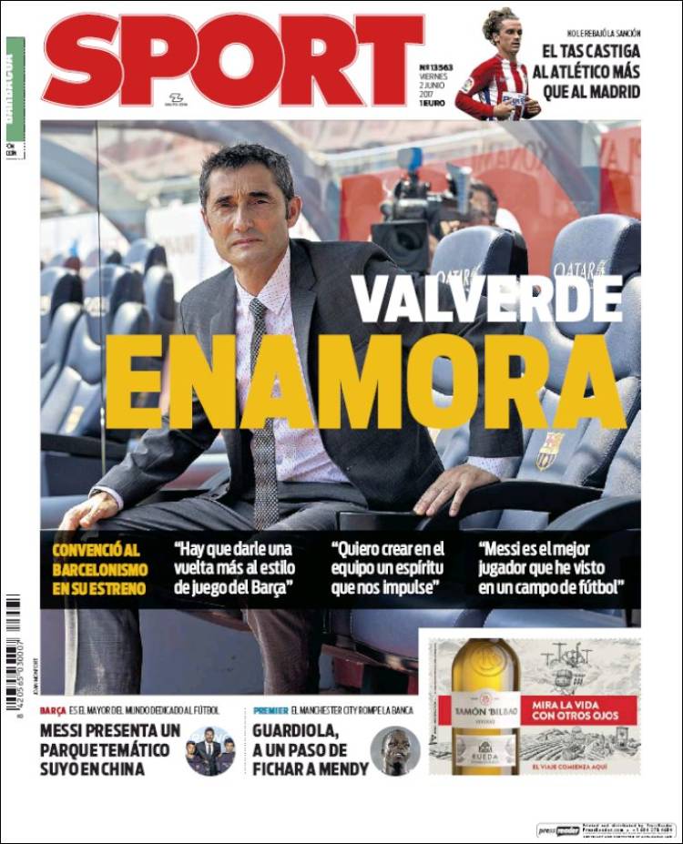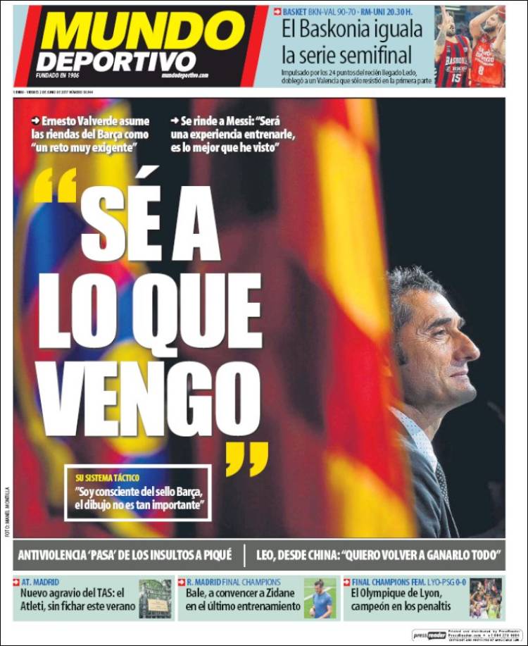 Si eres culé, no te preocupes. La noche de mañana puede ser también una de las mejores de tu vida si le va bien al equipo de Allegri. Pero no es eso, sino de Valverde, de lo que hablan tus portadas hoy. Valverde, ese señor que nos cae tan bien que va a tener que decir alguna tontería pronto para acabar con este sinsentido. El Txingurri aparece de guisa casi institucional en la foto de MD, donde ademá declara "rendirse" a Messi. Nos parece juicioso hacerlo. Es la determinación que conviene tomar, si se te pasa por la cabeza cuestionar el establishment, cuando tu adversario es mucho más poderoso que tú. Ríndete y disfruta. Al fin y al cabo, es un extraordinario jugador pese a cuya enorme aportación el Barça sigue a años luz por detrás del Madrid.