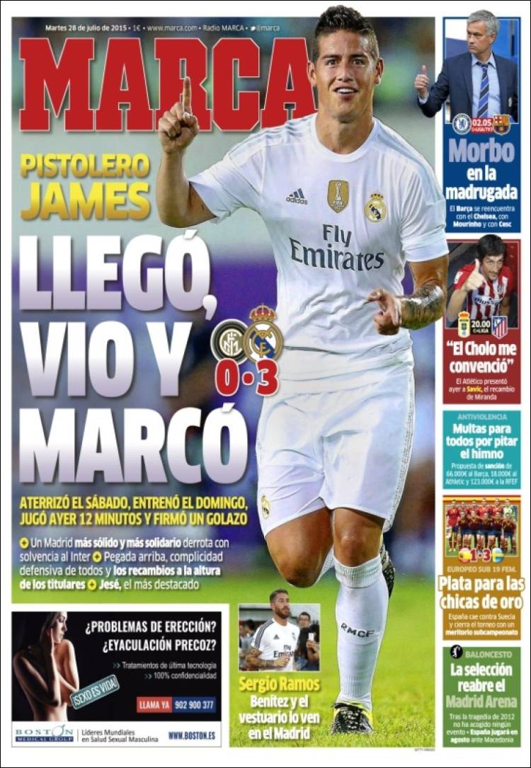 Marca también dice que todo muy bien, lo cual es razonable porque antes no había dicho que todo fuera un puta pena. Había juzgado mal -y hasta quizá con dolo en asuntos concretos- determinados extremos, pero no se había desbocado en el caudal de sarna y vitriolo antiflorentinesco de su competidor madrileño. Destaca Marca el golazo de James, poco menos que nada más bajarse del avión, y parecen estar de acuerdo con nosotros en una cosa: nos encontramos ante una leyenda en ciernes a quien solo una fatalidad inconcebible podría apartar de su destino, que no es otro que marcar una época.