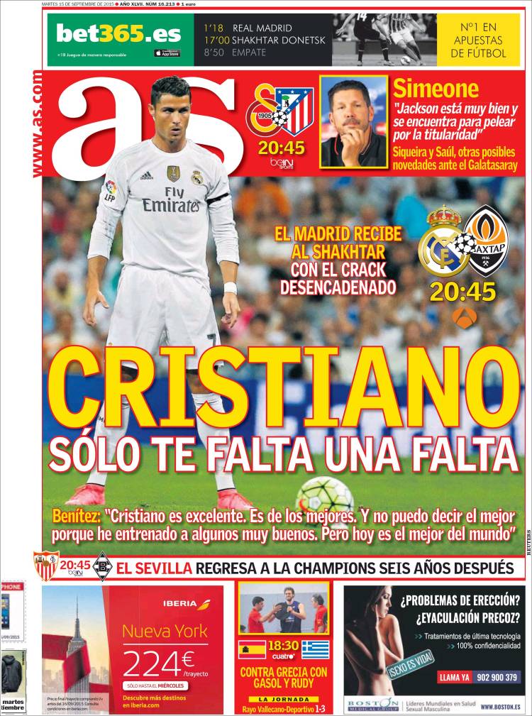 As trae a Cristiano en su portada, preparándose para tirar una falta, y titula con lo que se plantea (suponemos) como un ingenioso juego de palabras: "Cristiano, solo te falta una falta". Se nos habla de un "crack desencadenado" y el espíritu general que QUEREMOS detectar es halagüeño con el portugués pero, ¿hay un dardo envenenado con esto de la falta? Consciente de que, en su innato perfeccionismo, Cristiano sufre por cada pequeño detalle que no termina de salir bien, ¿busca As poner nervioso con el detalle de los golpes francos a quien viene de marcar cinco goles en el mismo partido, aun cuando ninguno de ellos haya sido de falta? ¿Pretende esta portada animar a Cristiano a seguir porfiando en esa suerte, que en los últimos tiempos le es esquiva, o por el contrario anda en el intento torpe de ponerle nervioso? Ya nada sabemos, dado el historial de quien nos presenta la historia.