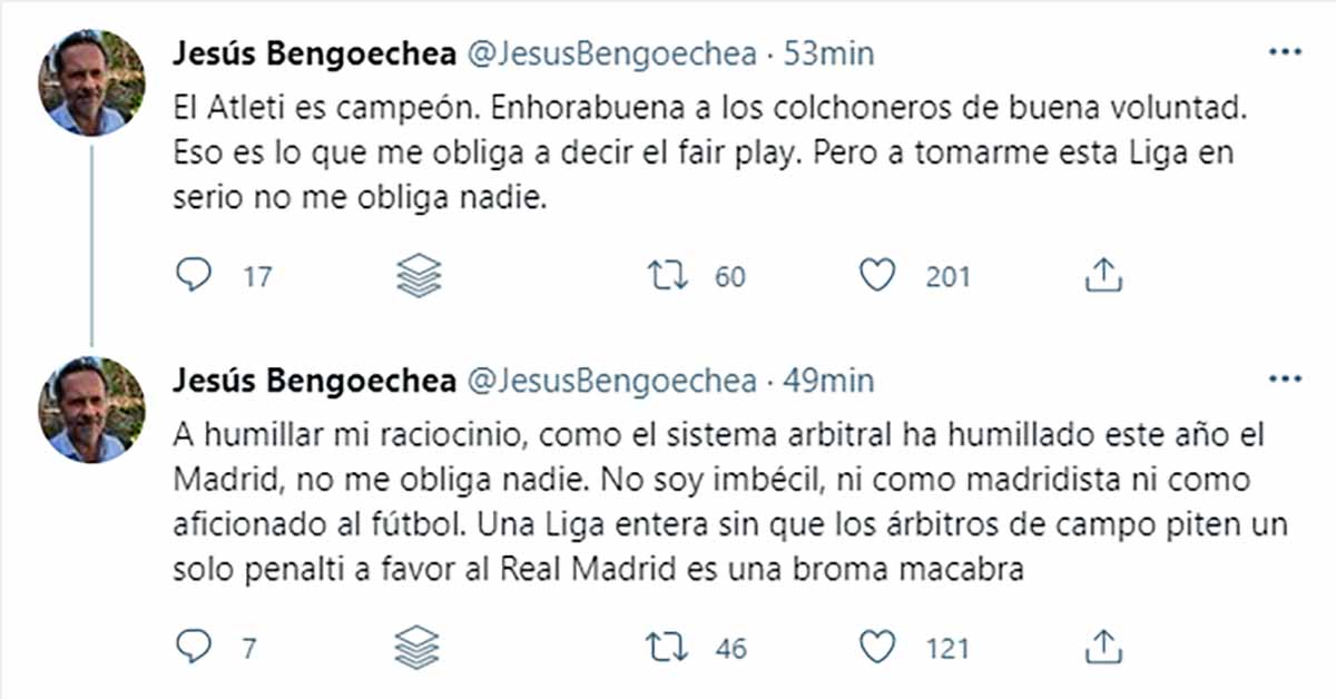 ¿Pero cómo que el Atleti aprovecha para ganar en buena lid? O una cosa u otra, señor Bengoetxea, aclárese, o es una liga vergonzosa y escandalosa o está ganada en buena lid. Las dos, no. Igual con los errores propios del Madrid, aunque confunde errores y carencias, que son cosas muy distintas. O ha habido errores del Madrid o es una Liga vergonzosa que era imposible de ganar y no podía ser. O una cosa u otra. Las dos, no. Aclárese. Aunque la verdad es que está bien claro.