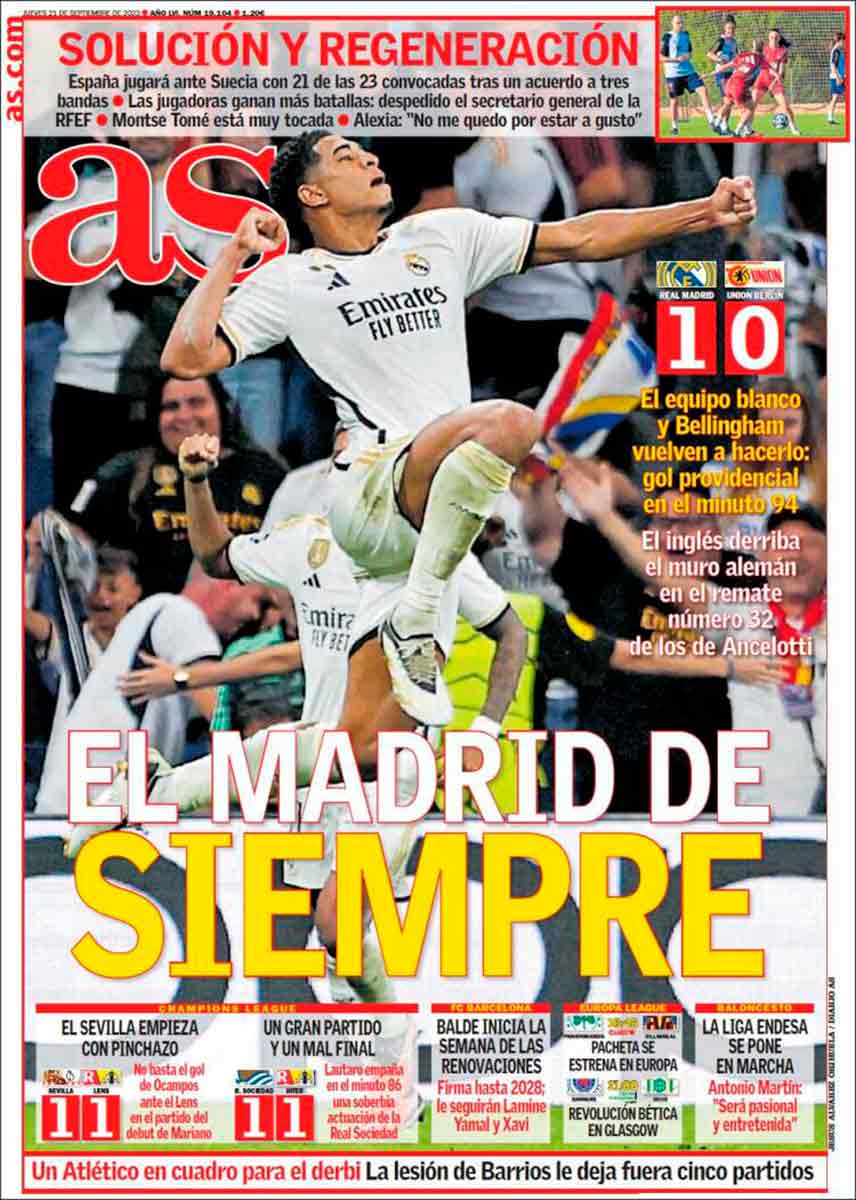 «El Madrid de siempre». Salir, remontar, el rollo de siempre, golito al final, flipar a la gente (tampoco pretendemos que se os cuele esta melodía extrema en el cerebro). Los compañeros de As no han resistido y han sucumbido a utilizar la palabra «muro» en su portada, si bien no la han empleado en el titular ni la han acompañado con «de Berlín». De paso, nos informan que el gol de Jude sucedió en el remate número 32 sobre la portería alemana. Ha habido temporadas enteras en las cuales no ha llegado a rematar 32 veces entre todas las competiciones el Atlético de Madrid.