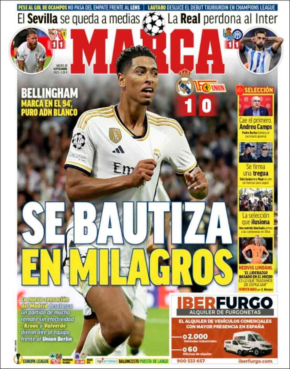 «Se bautiza en milagros» titula Marca en alusión a Bellingham. Creemos que Jude se cayó en la marmita de los milagros al nacer y desde entonces está impregnado por la Providencia. Está dándole la razón a quienes sostienen que el Madrid contrató a Jude con la intención de que fuese el Benzema del equipo. Karim era un delantero bastante centrocampista y Bellingham es un centrocampista bastante delantero. Lo que no esperaban es que las cualidades de Raúl González también adornasen al cinco merengue.