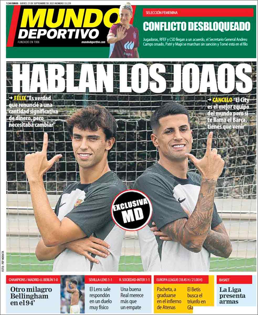 En Mundo Deportivo también catalogan lo de Jude como milagro. Lo hacen en chiquitito porque el Madrid ganó. Su portada es para los Joãos, Félix y Cancelo, de quienes dice que hablan. Entendemos que hablarán de cómo inscribir jugadores cuando no se cumplen, un año más, las normas que rigen la inscripción de futbolistas.