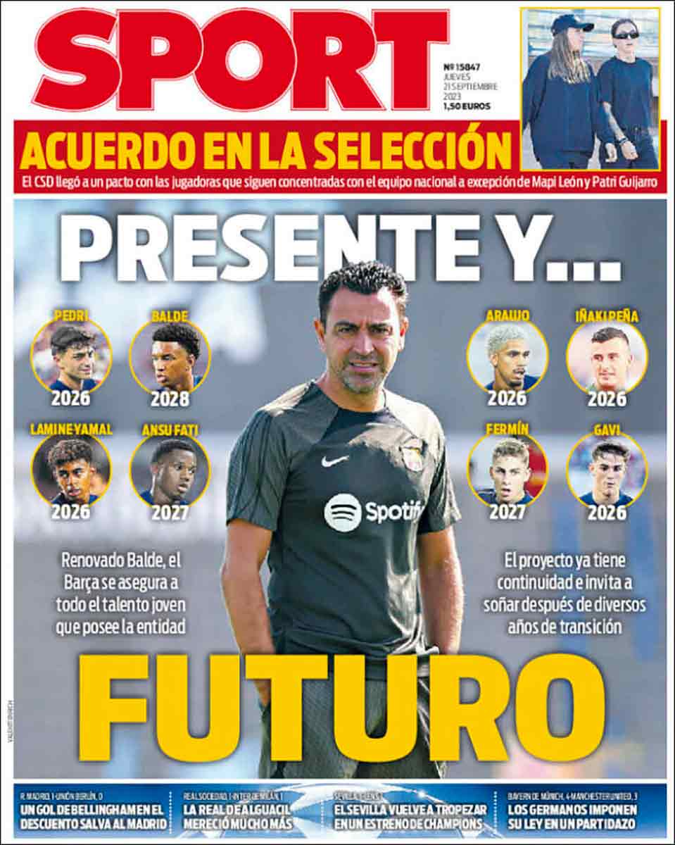 Sport opta por hablar del presente y del futuro sobre una fotografía de Xavi con el mismo aspecto que luce un bohemio el domingo por la mañana tras una jornada de catorce horas de fiesta. Frontispicio autárquico para consumo interno con las cuentas de la lechera hechas en base a los jóvenes de la plantilla. Ya sabéis que siempre se dice que la cantera del Barça es maravillosa, sobre todo en comparación con la del Madrid, y luego uno observa que, pasados los años, solo aguanta Sergi Roberto, el resto de canteranos sufren el efecto gaseosa, debutan por todo lo alto y pasados dos o tres años desaparecen. Mientras en el Madrid perduran más.