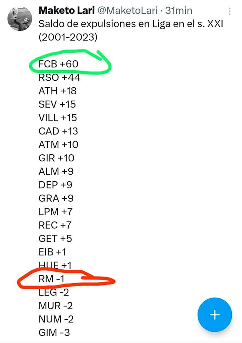 ¿Suficiente como para que no le piten a un equipo un penalti en contra en 78 partidos? No, para eso hace falta un Negreira dentro de la cúpula arbitral, como ya ha quedado probado; pero sí lo suficiente como para que el saldo arbitral de estos equipos sea razonablemente superior a los de la mayoría de los equipos de sus ligas. Por ello, la liga española no es una muestra realista, porque aun tomando por bueno el argumento de los culés, el Real Madrid habría seguido siendo dominante y con mejores jugadores en 32-36 de los 38 partidos ligueros de la temporada. No es explicable ni razonable que el digamos mal llamado segundo equipo de España en aquella época (ahora sabemos que nunca dejó de ser el primero), tuviera esta diferencia de saldo arbitral de tarjetas rojas. Sobre todo, teniendo en cuenta la plantilla que ha tenido el equipo blanco en las dos últimas décadas.
