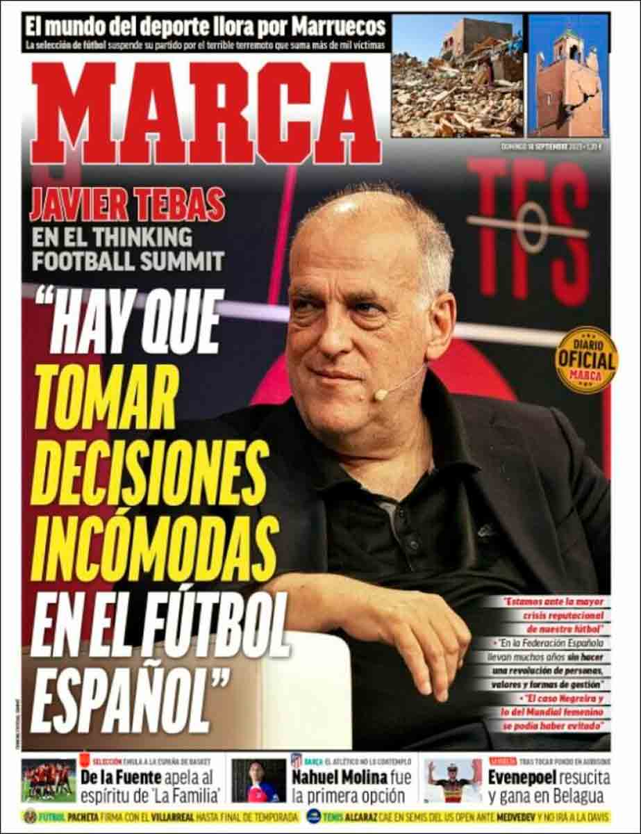 Cuatro son los héroes del día y cuatro son las portadas, como cuatro era precisamente los Cuatro Fantásticos, uno de ellos de piedra, más o menos como podría tener la cara -si no de cemento armado- el héroe que nos presenta Marca en entrevista exclusiva. Su nombre mundano es simplemente Javier Tebas, trasunto acaso de Clark Kent, quien hacía el papelón de no enterarse de nada cuando en realidad el Superman que habitaba en él iba por delante del resto en conocimiento y habilidad.