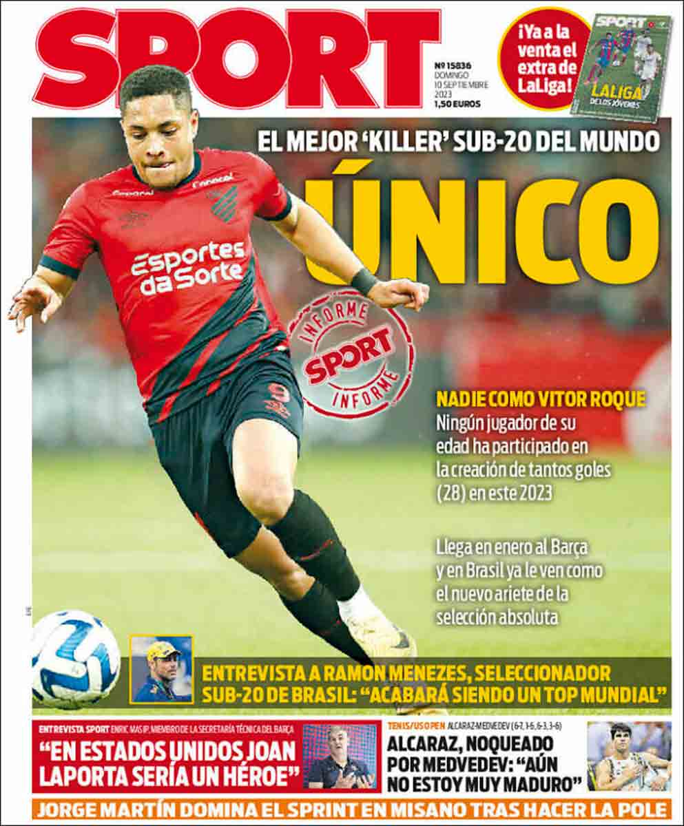 Rivaliza el héroe reseñado con el que ofrece la portada de Sport en sus bajos, si bien ya apunta maneras el delantero brasileño que ocupa casi toda la primera plana: Vitor Roque para los humanos, killer sub-20 para los avezados culés, tan propensos ellos a la creación de héroes de barro, de proyectos de héroes y hasta de héroes más estrellados que estelares.